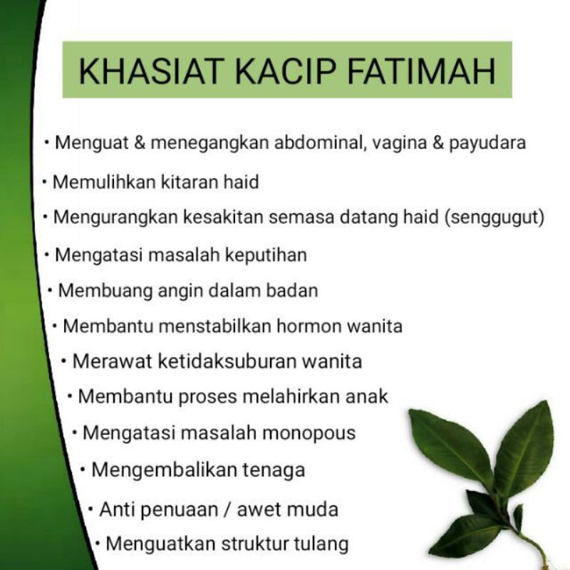 Hasil Kajian Universiti Teknologi Malaysia UTM Khasiat Kacip Fatimah Phyto Plus. Khasiat dan kehebatan kacip fatimah berupaya memberikan rawatan pada kesihatan dalaman dan luaran wanita. Labisia pumila Myrsinaceae popularly known as Kacip Fatimah has been used by many generation of the Malay women to induce and facilitate childbirth as well as a post-partum medicine Burkill 1935.